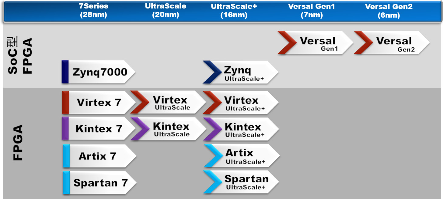 AMDのFPGA製品は、ソフトウェアシステム回路を内蔵したSoCタイプと、すべてFPGAで構築されたタイプに分かれます。